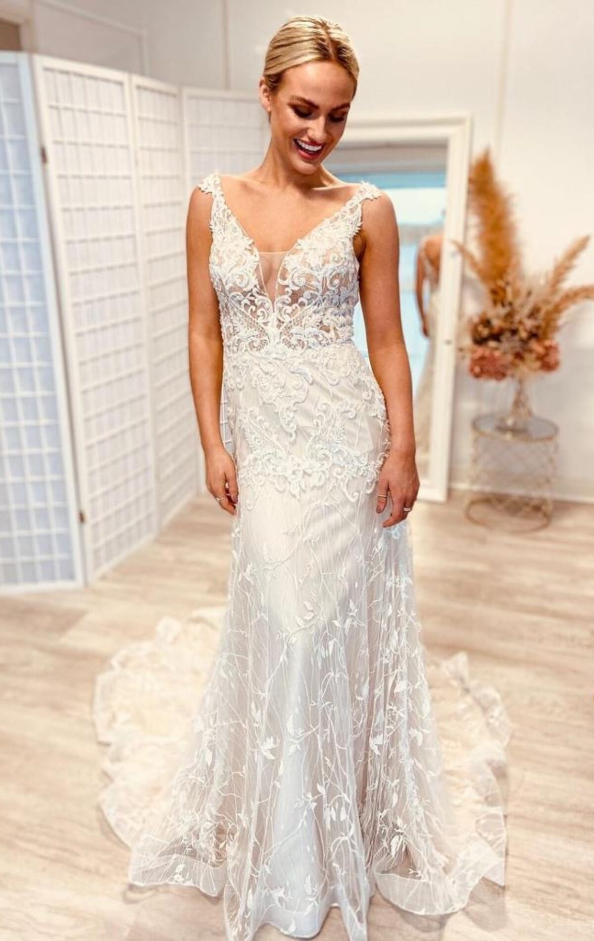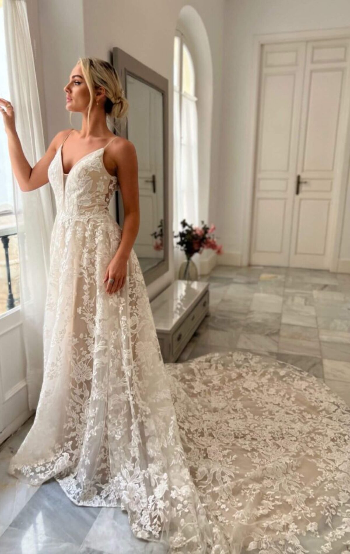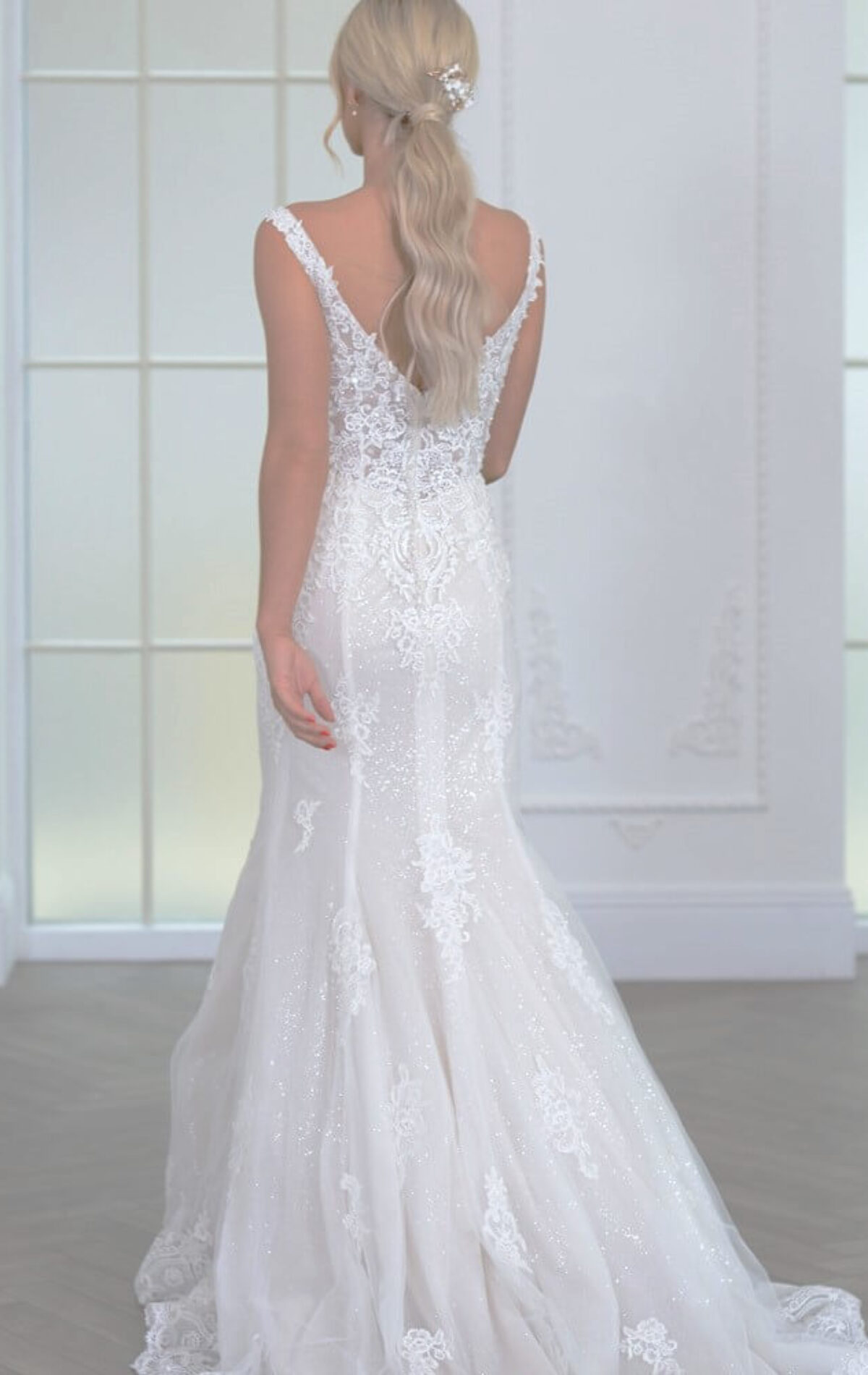 Fall in love with Aster. A floral fit & flare gown in soft, sparkly tulle. With an illusion bodice, delicate straps and a statement lace back, she’s romantic, radiant and made to shine on the dance floor.