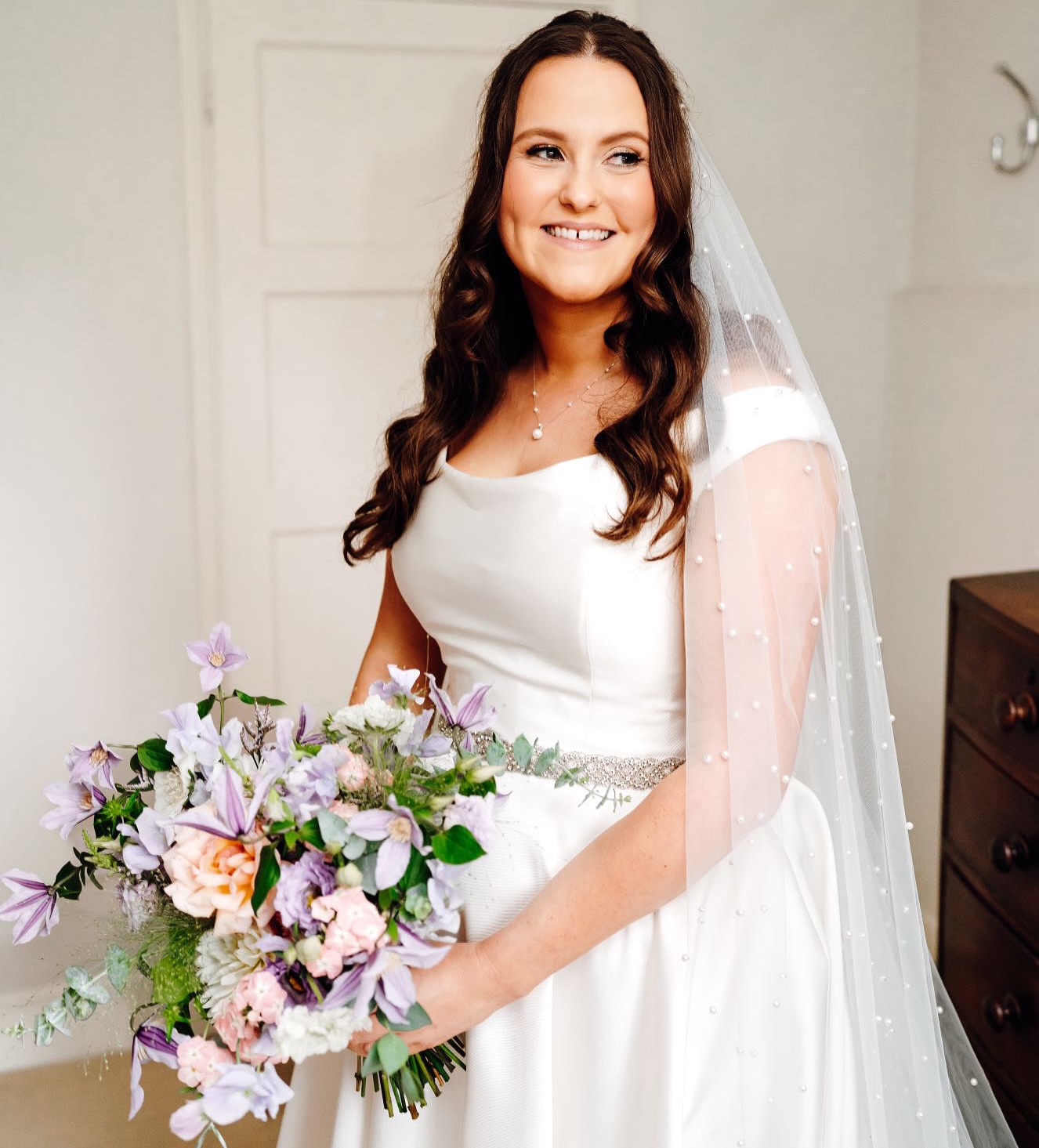 Anna is scattered with dozens of soft ivory pearls, made from a single layer of delicate tulle and finished with a gentle, hand-cut edge. One of our faves for the bride who loves a minimalist look.