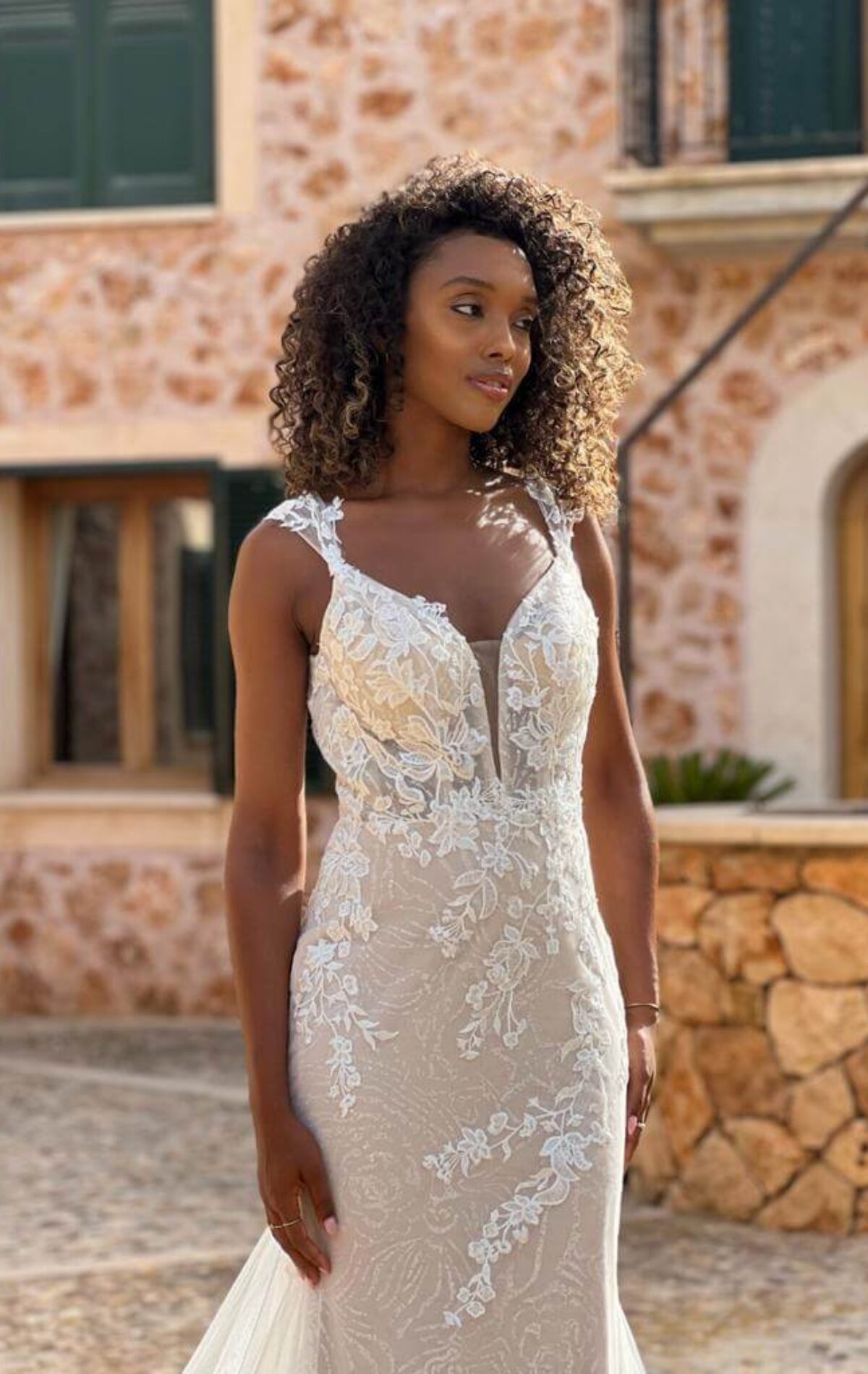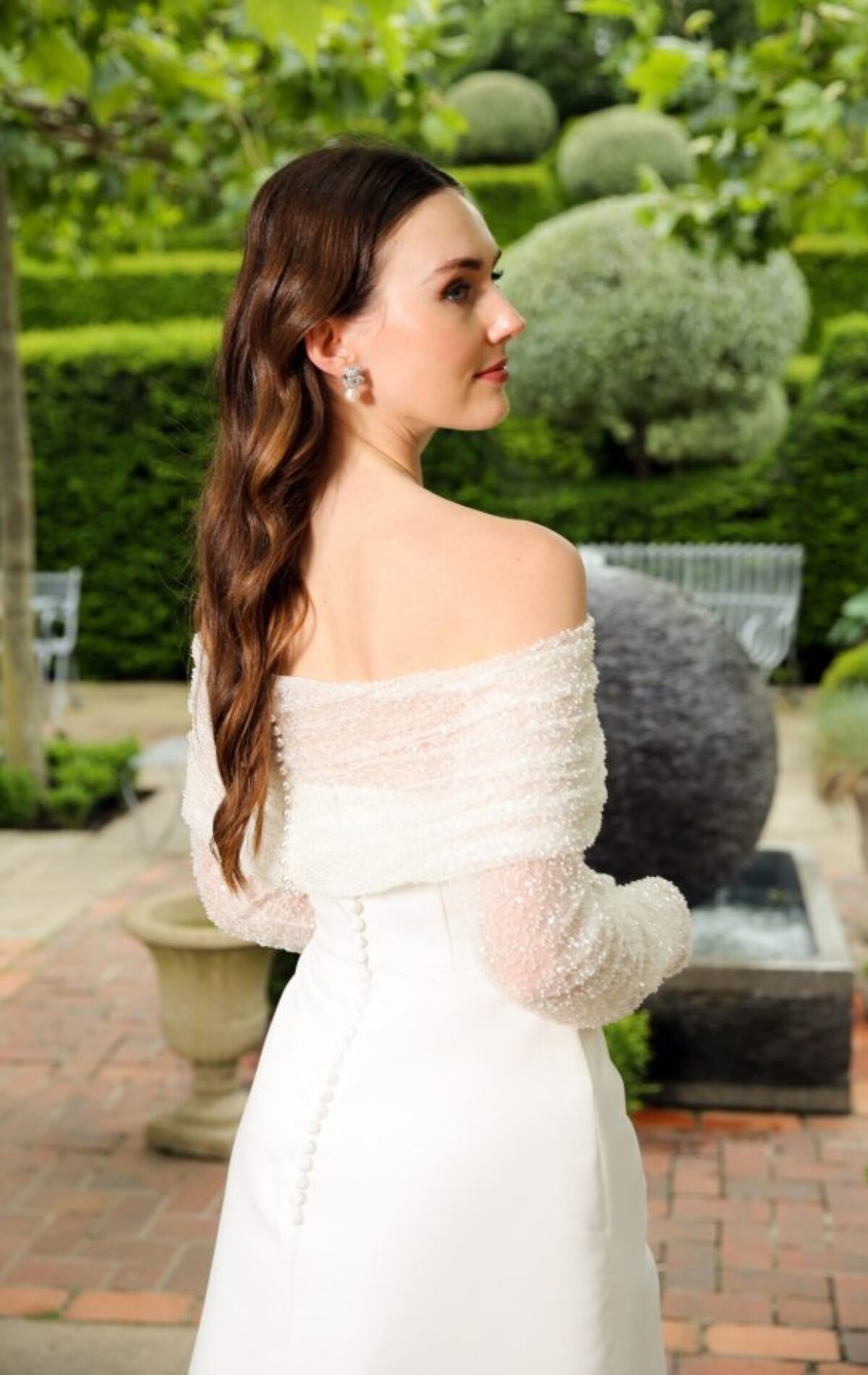 Black tie, Gatsby, Festival Vibes, Vintage, Rustic. Just some of the wedding themes this dress pairs perfectly with. This glamorous ‘Art Deco’ inspired fit and flare gown is so unique with its vintage-style crystals, sheer neckline and scallop edged sleeves. A true work of art, reminiscent of the opulence of the 1920s.