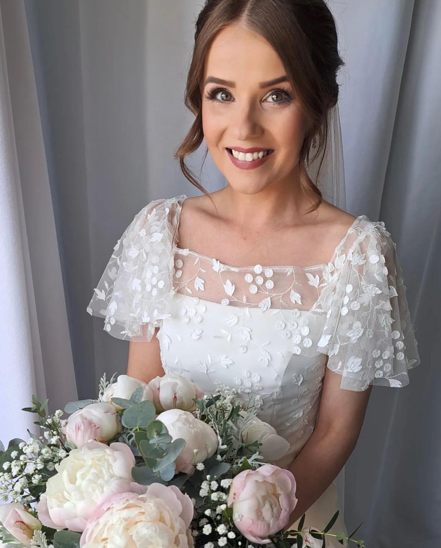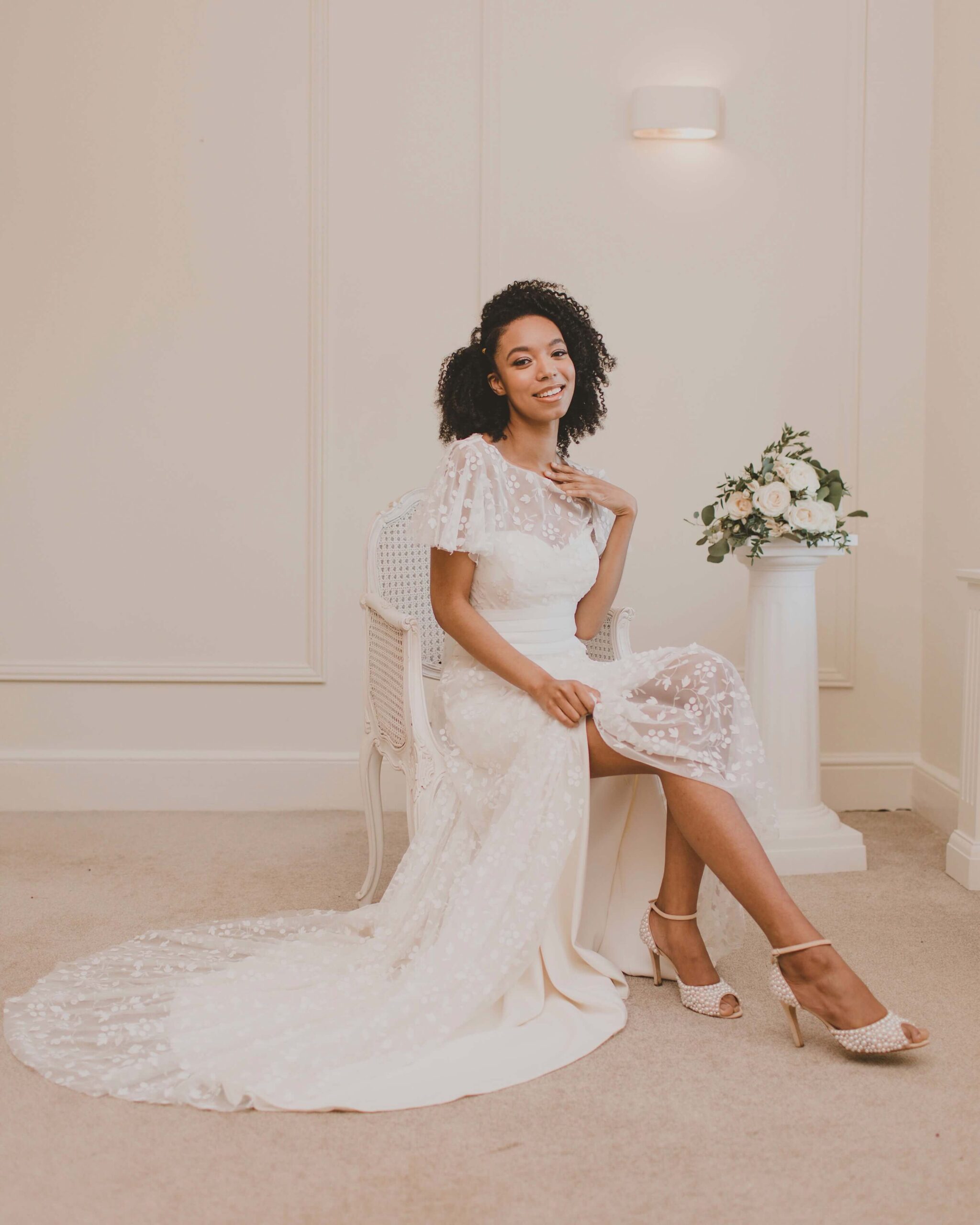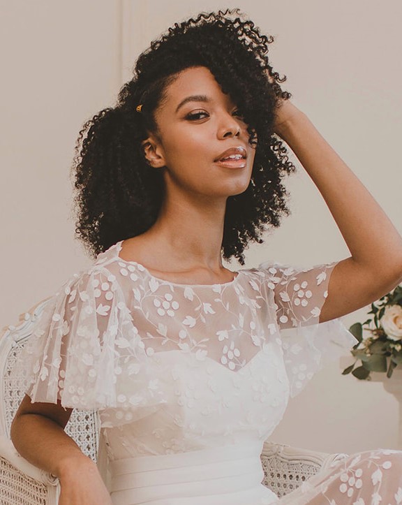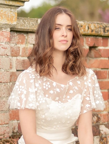Complete your boho bridal look with our soft and dreamy lace shrug. Featuring modern lace and delicate flutter sleeves, it enhances the dreamy allure of your gown. Tie it up with a sweet bow at the back for a whimsical finish.