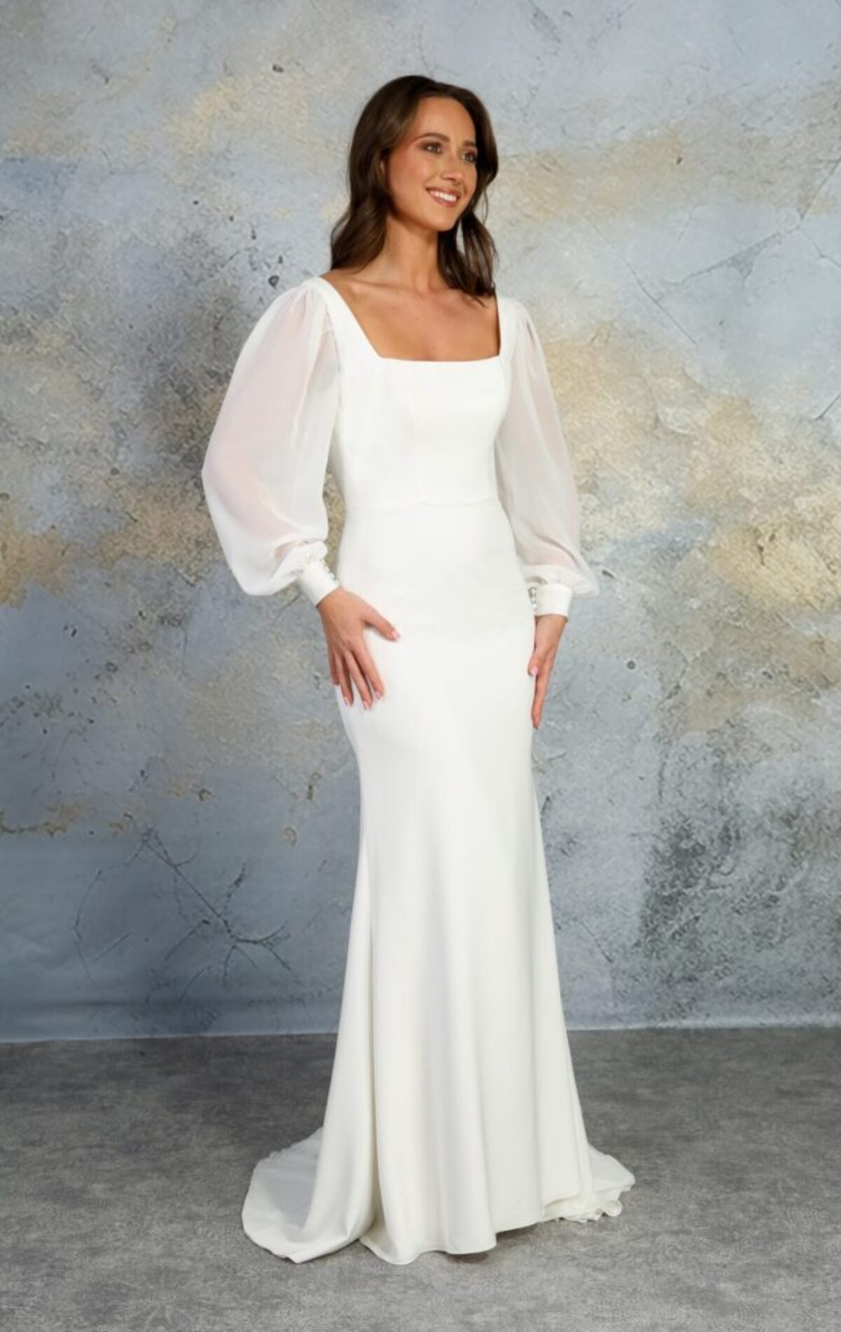 If you’re after something sleek, simple and incredibly chic, this is the dress! This figure hugging crepe fits like a dream, hugging every curve. The square neckline is perfectly balanced by a fitted skirt and the V-shape back detail flows into a beautiful crepe train for just the right amount of drama.
