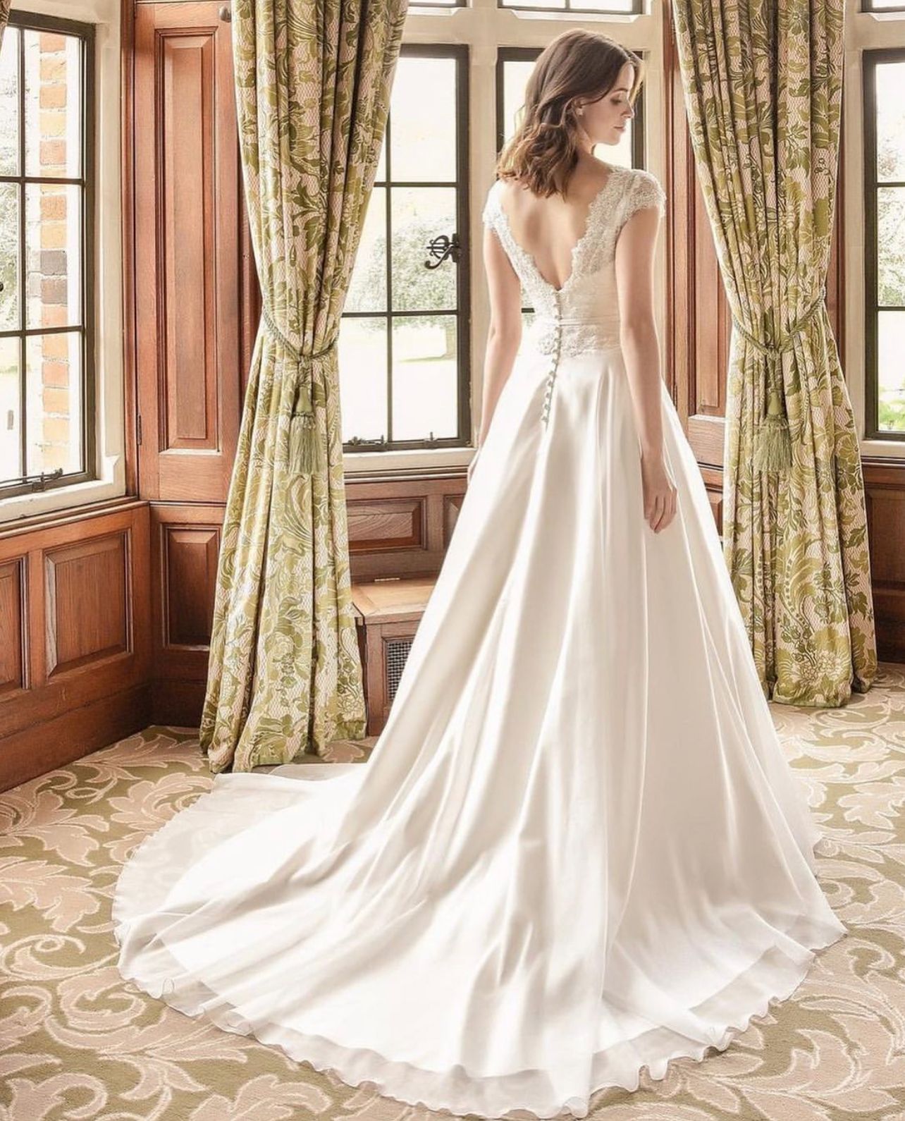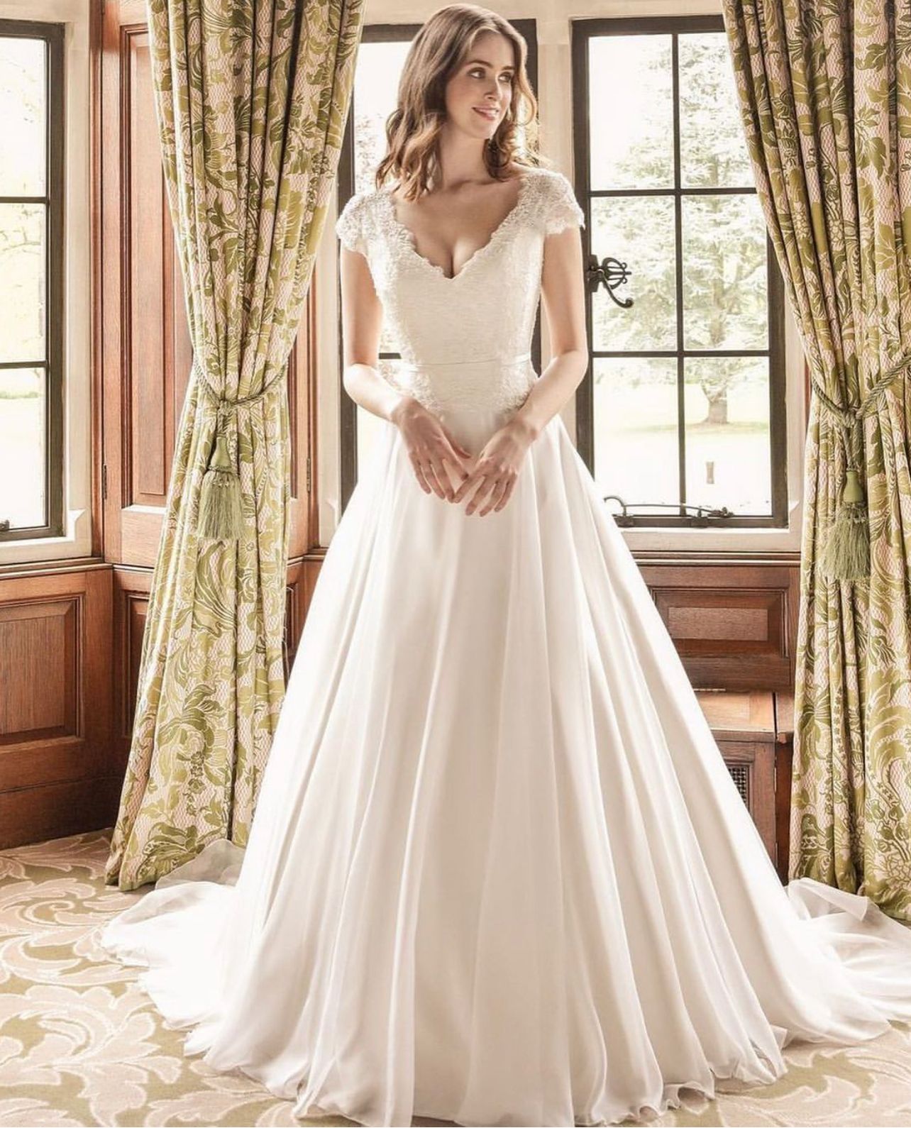 Step into a poetic symphony of elegance with our enchanting A-line wedding dress. Delicate lace adorns the bodice, graced with whimsical cap sleeves that add a touch of romance. The dreamy organza layer over the skirt floats ethereally with every step, creating a vision of timeless beauty