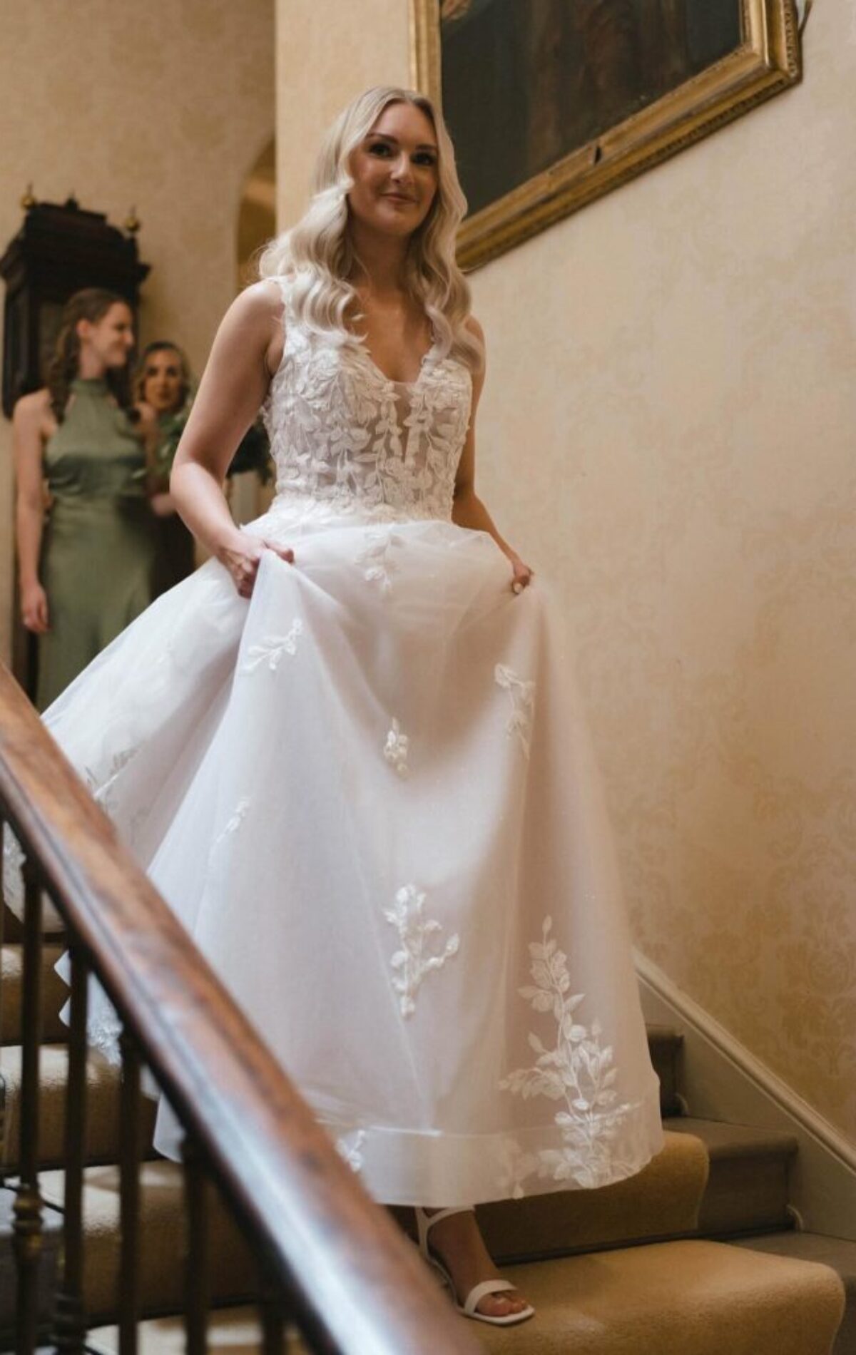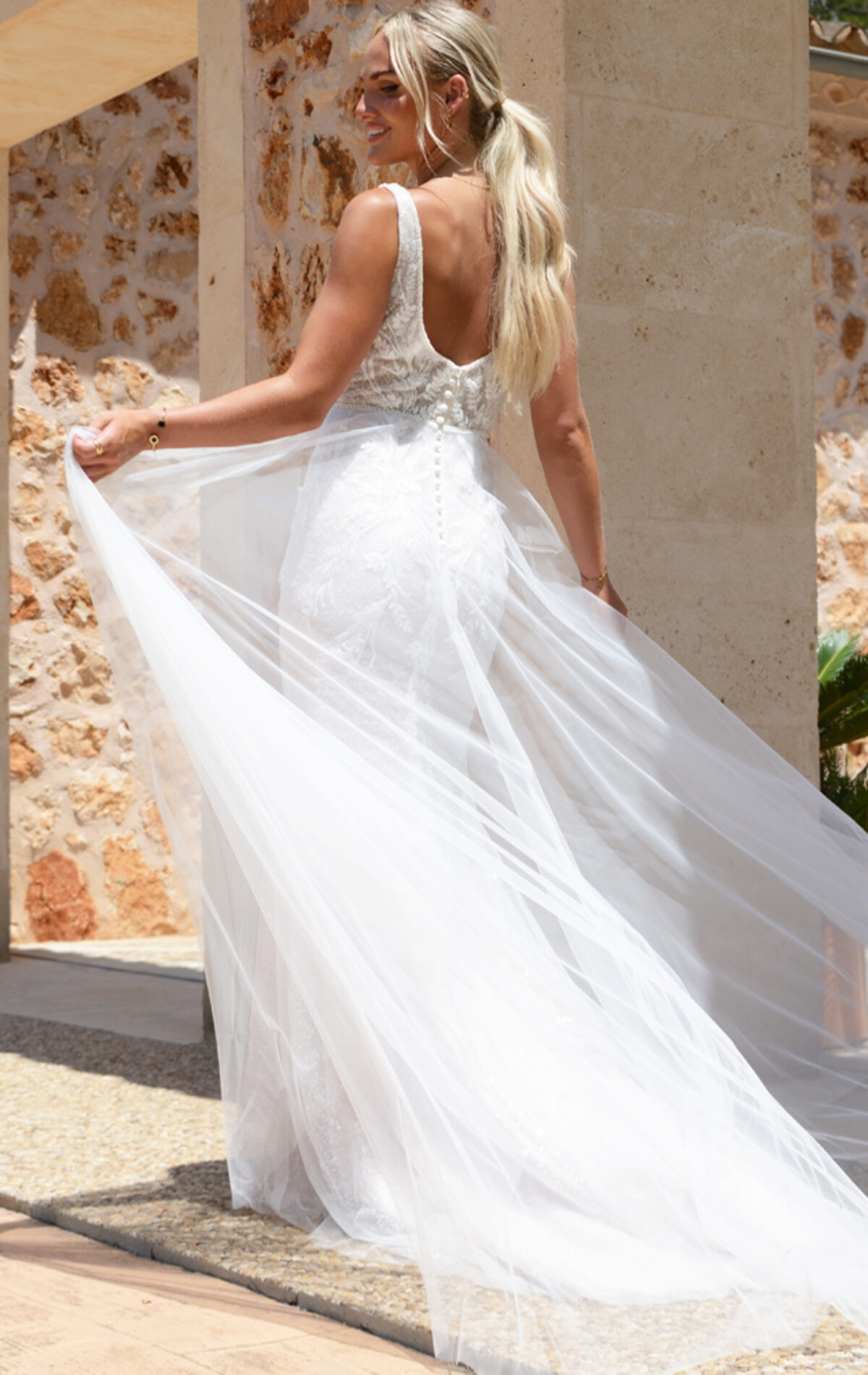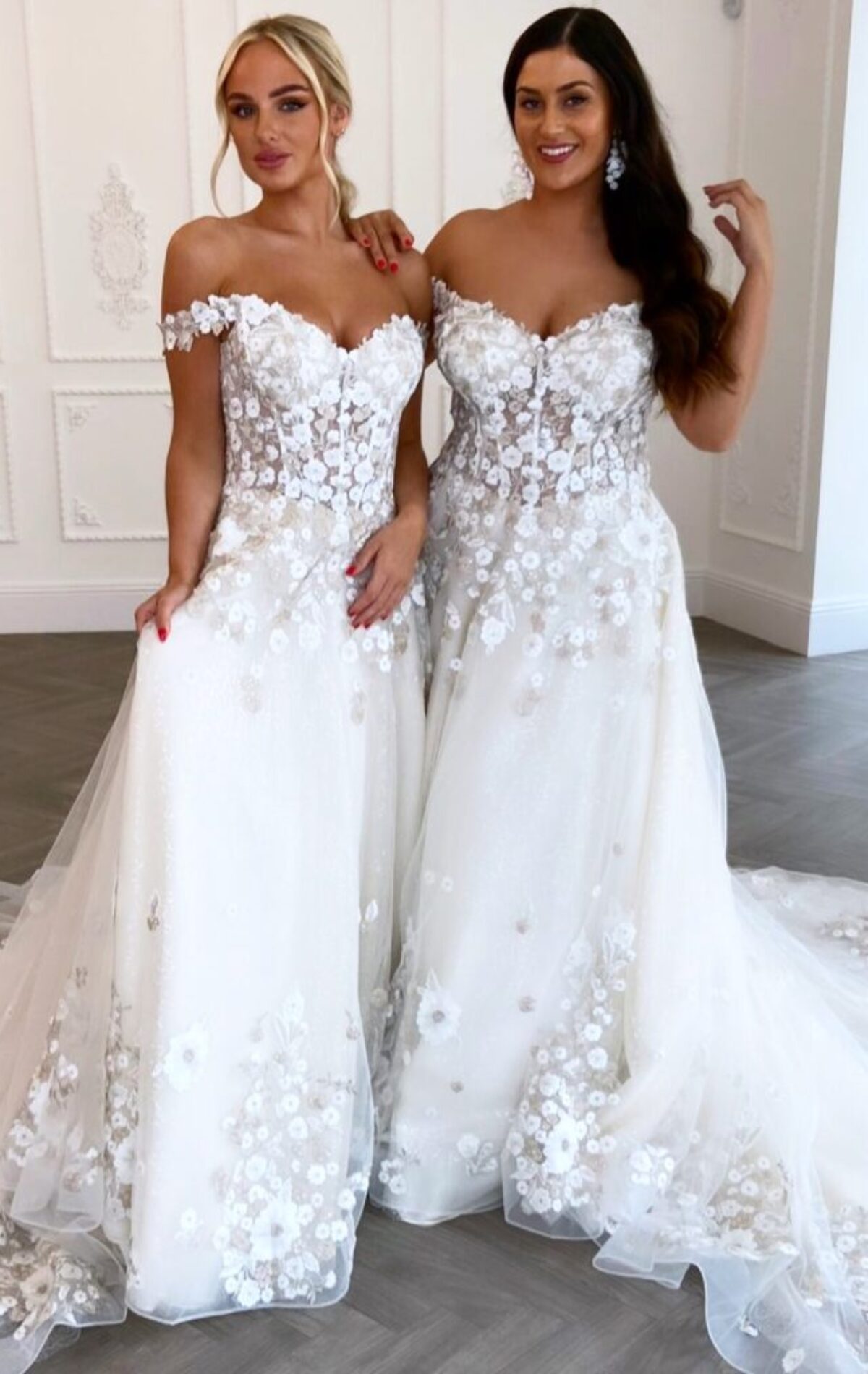 Laura brings together boho glam and ethereal charm with a floaty A line shape, soft lace embroidery and a light catching skirt. A true boho dream.