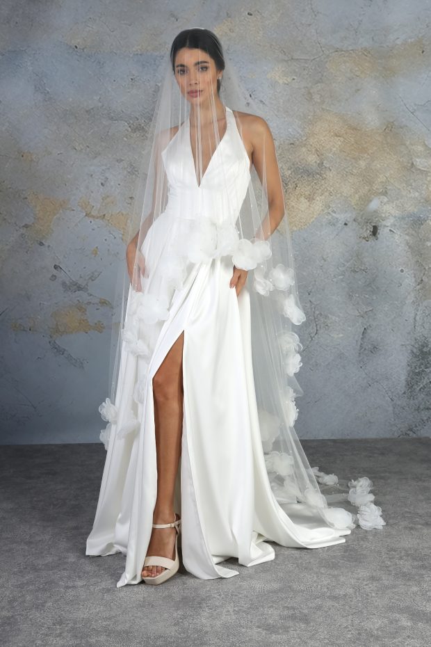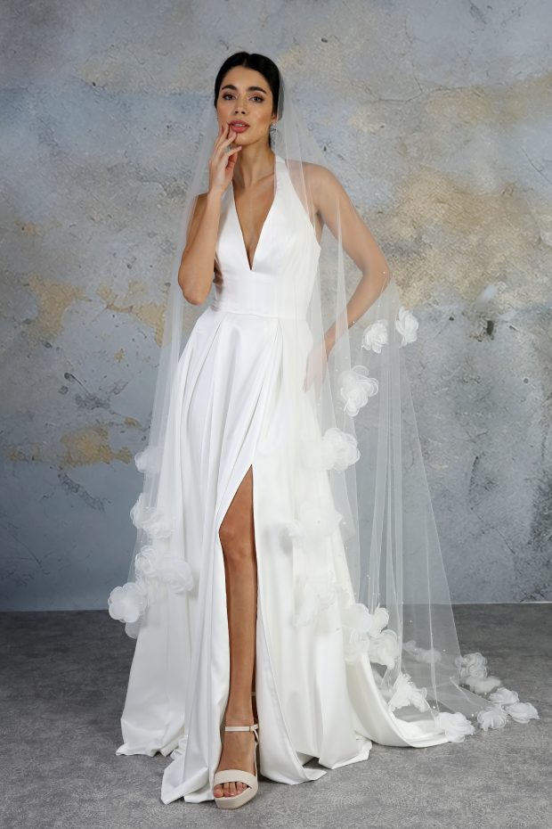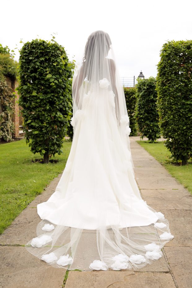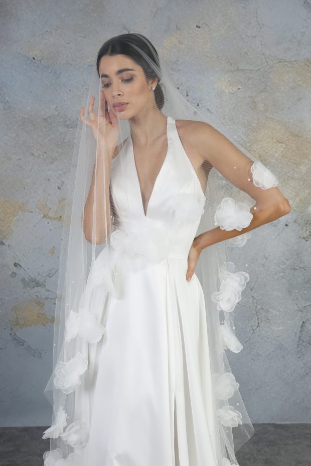 Rosanna is edged with 3D organza flowers and finished with a delicate pearl scatter. The ultimate statement veil for adding texture, sparkle & drama to your bridal look. Matching dress available. Click here to view.