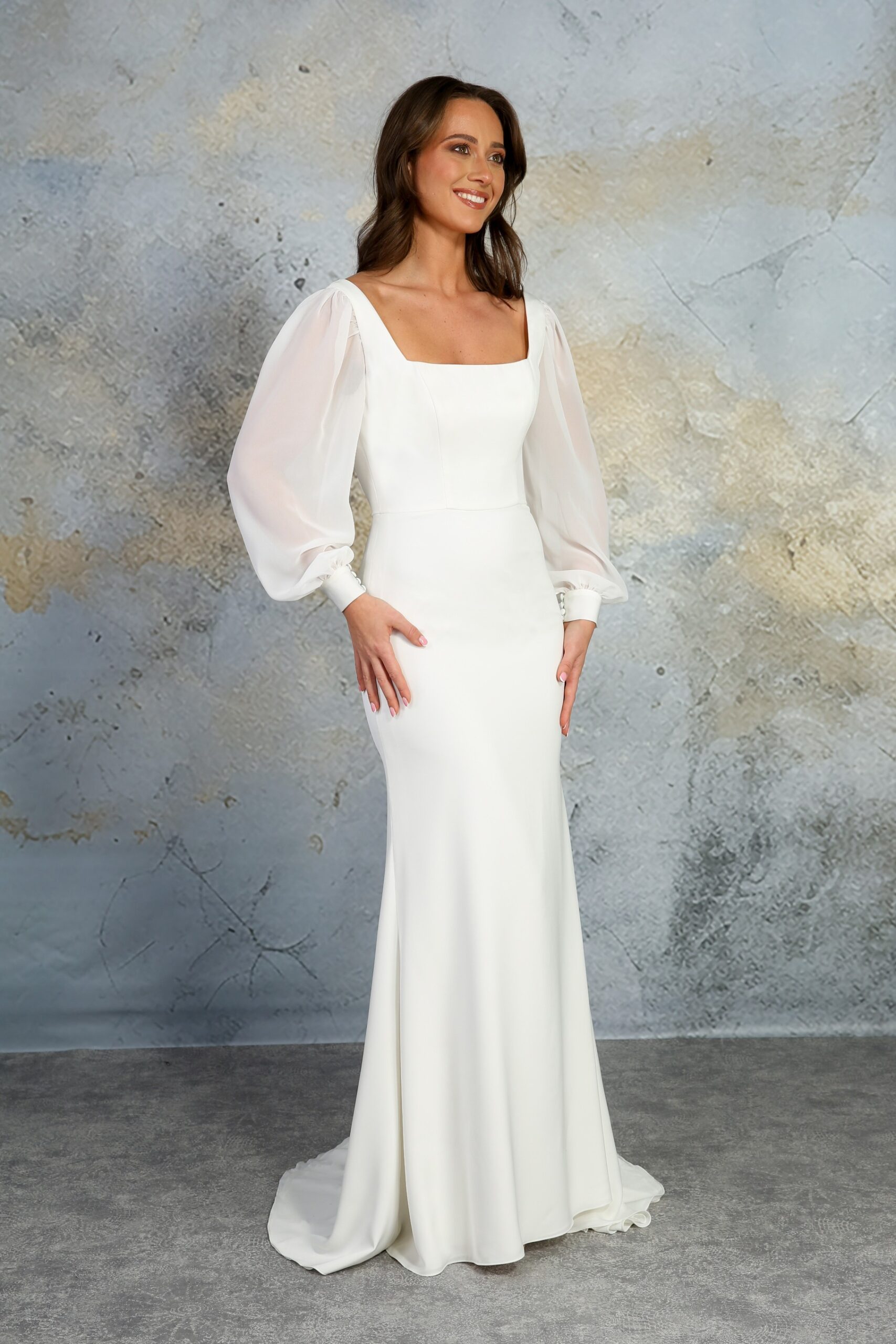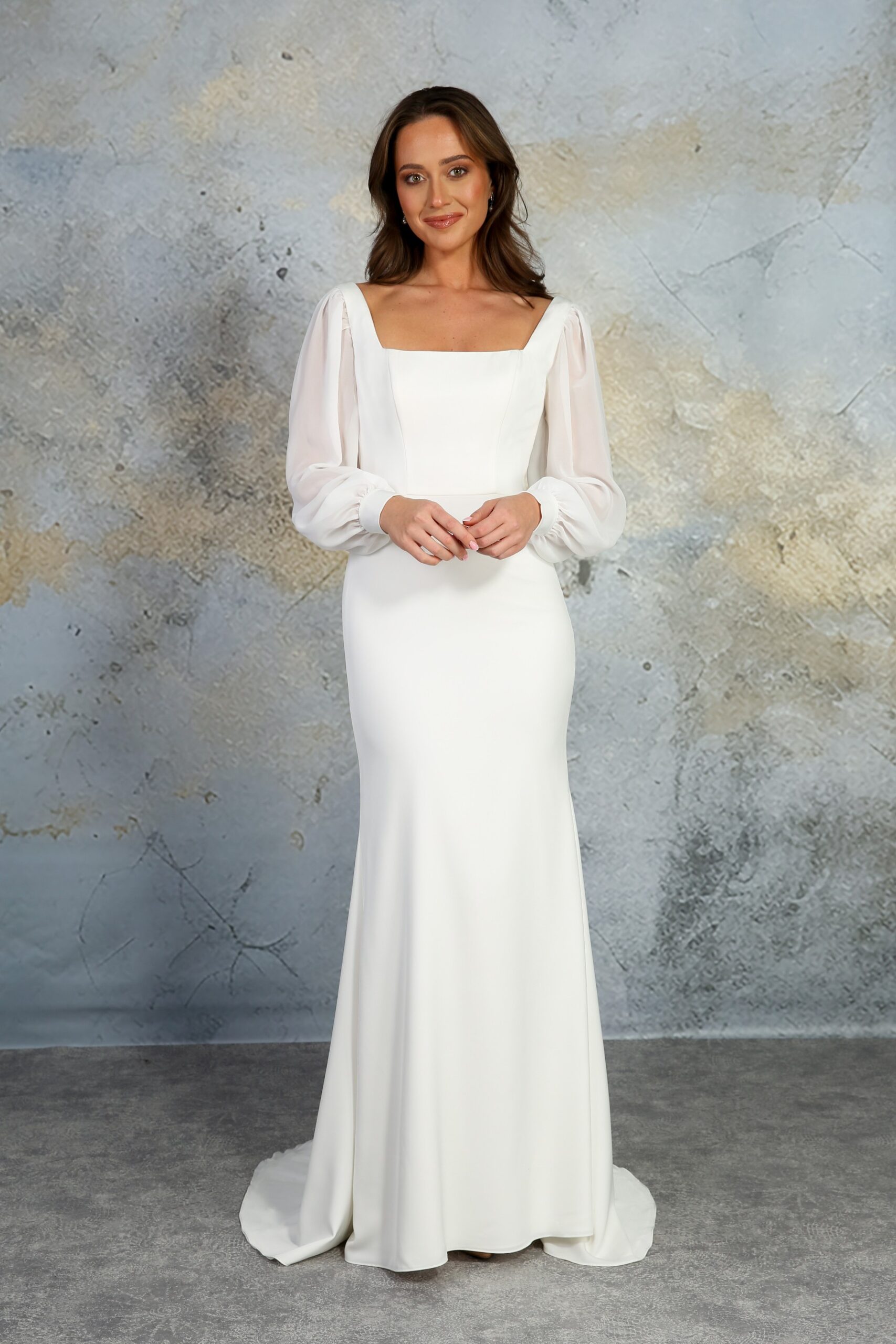 Serene is modern romance at its finest. The all over crepe flows beautifully over the figure, while floaty chiffon sleeves with satin cuffs add a soft, elegant finish. Light, graceful and utterly dreamy, Serene is a gown that lives up to her name.